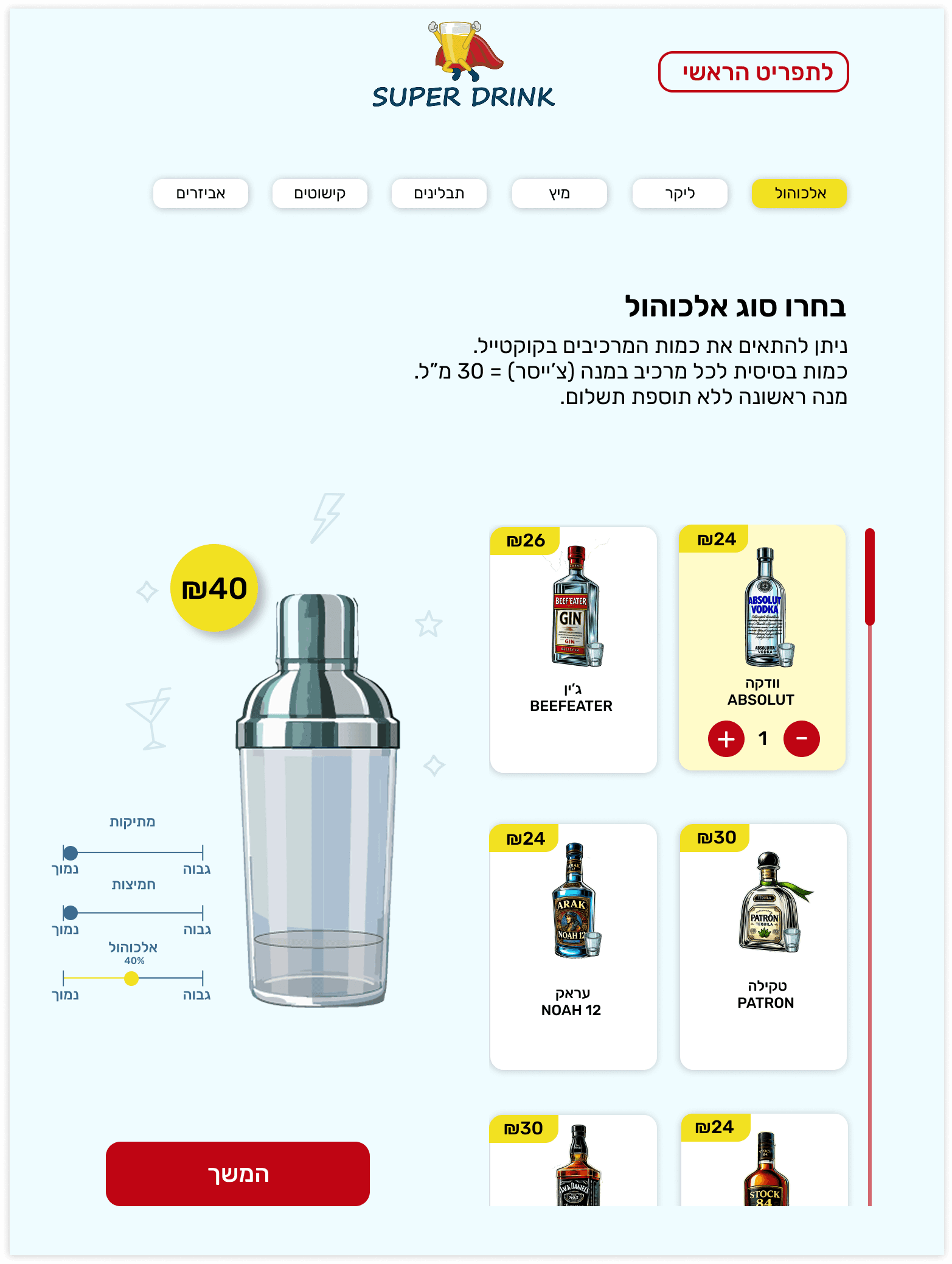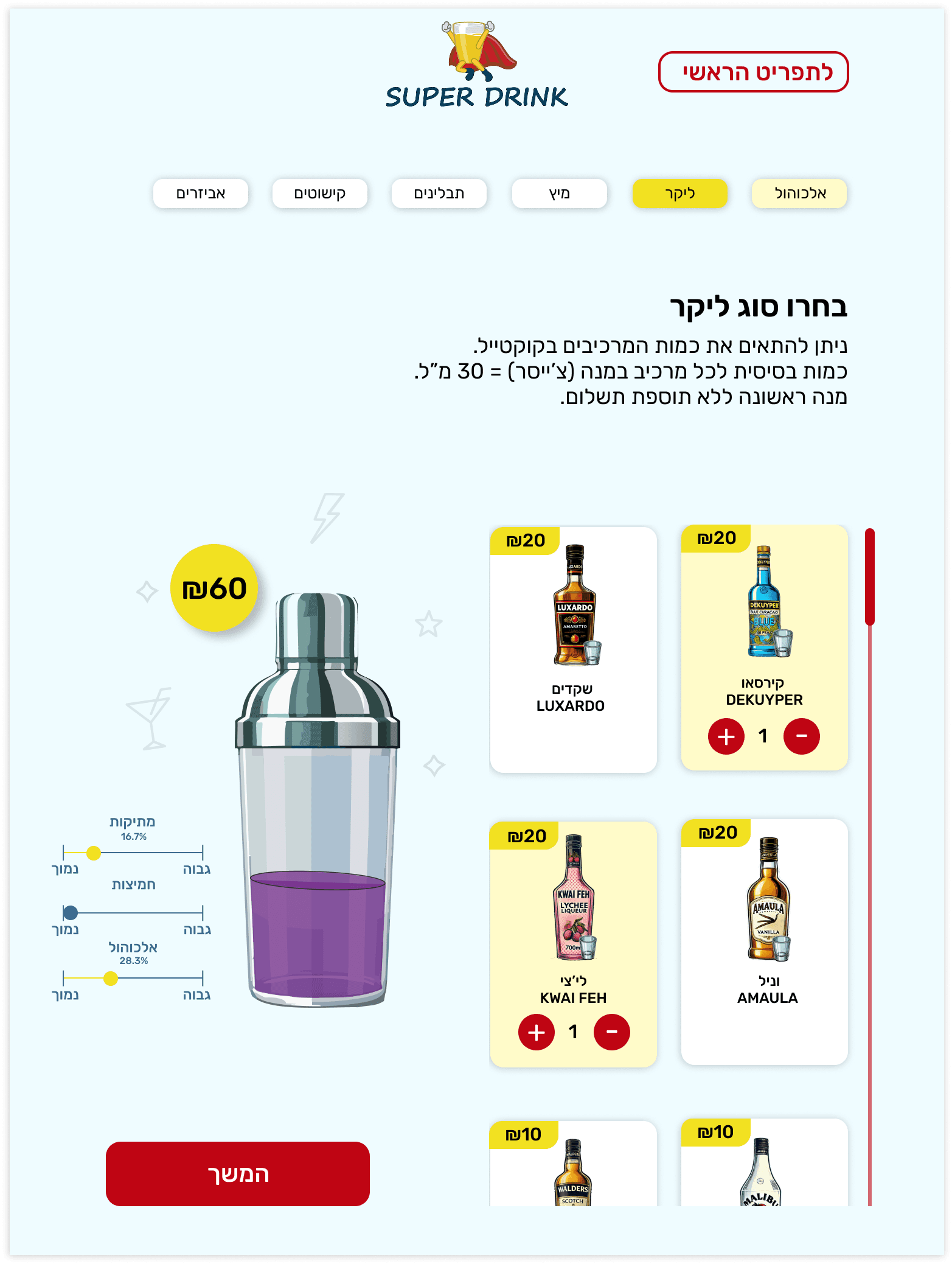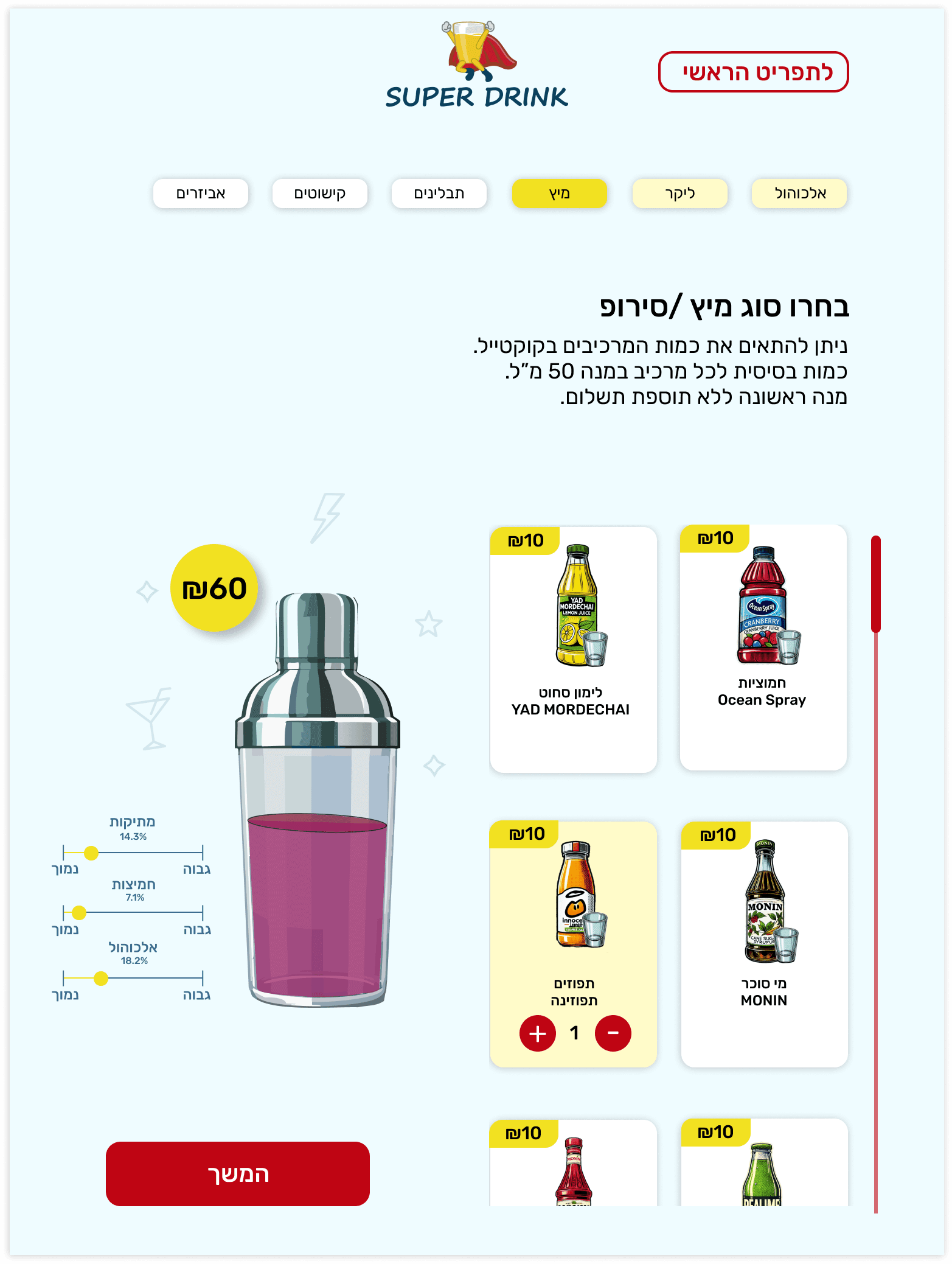 This project centers on a superhero-inspired interface for a digital cocktail machine. Based on user research, I created a precise flow that supports two paths: pre-made cocktails and a build-your-own experience, with a focus on clarity, fast decision-making, and smooth guidance throughout. I also used AI tools to create custom ingredient illustrations and designed a Visual Build Preview that lets users see the drink come together while tracking sweetness, sourness, and alcohol levels in real time.